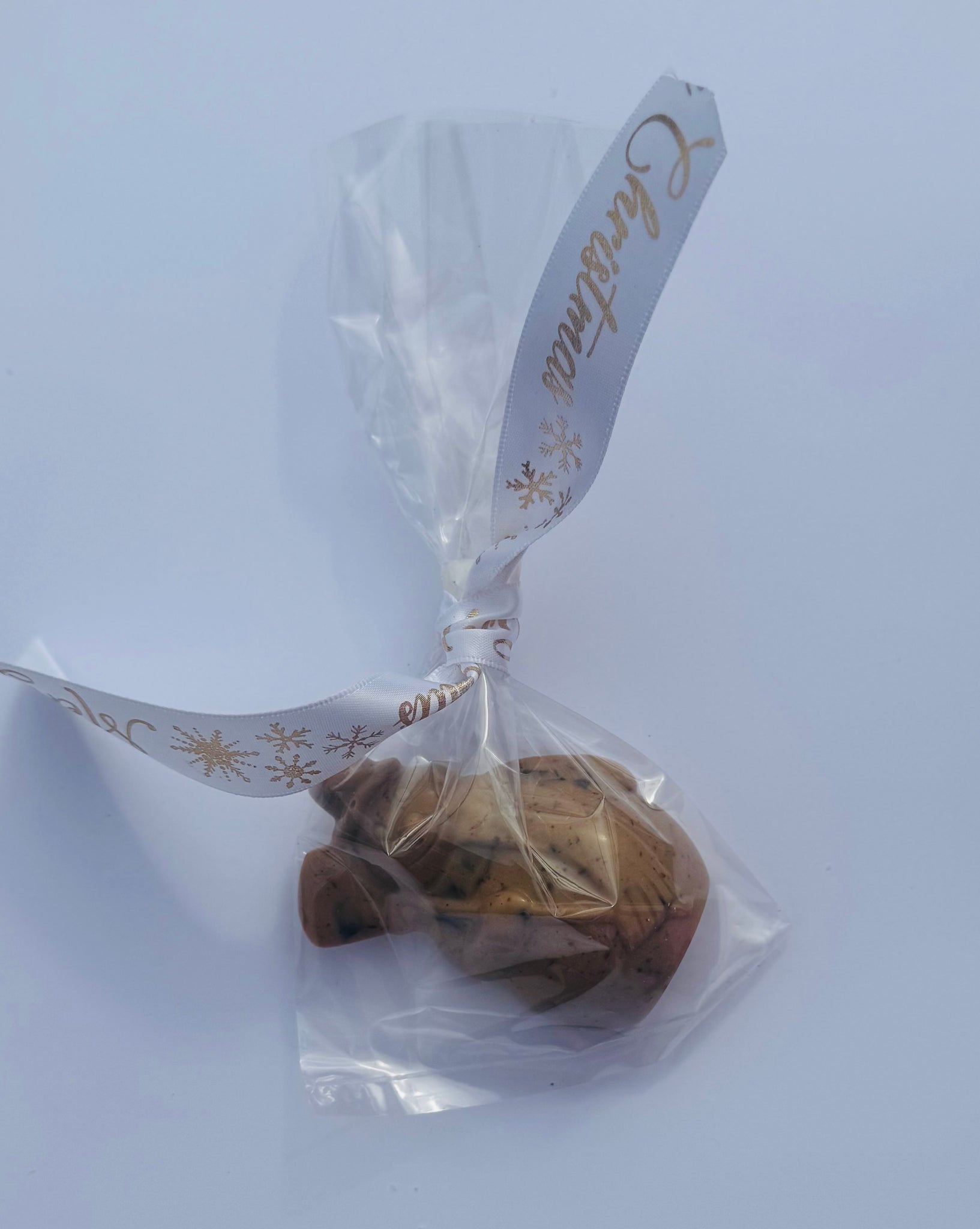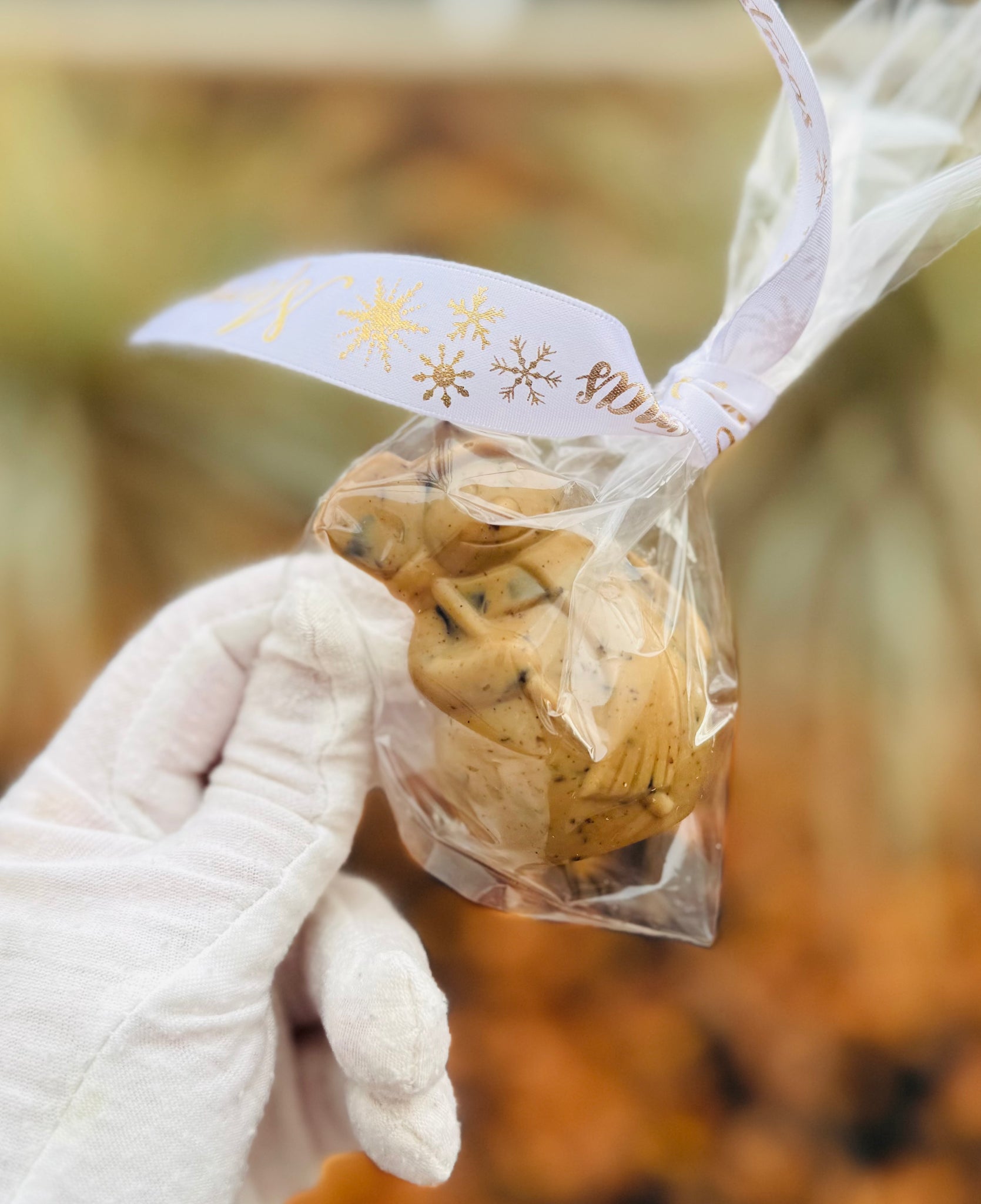 This isn’t any ordinary white chocolate. This is Oat Milk white chocolate mixed with a lightly burnt caramel.