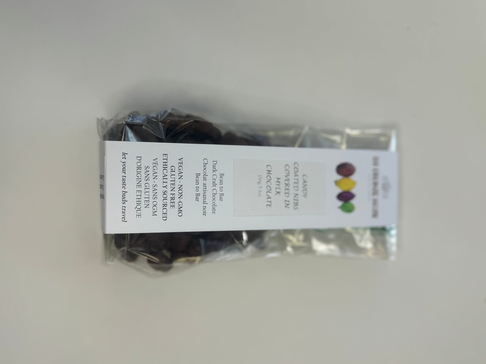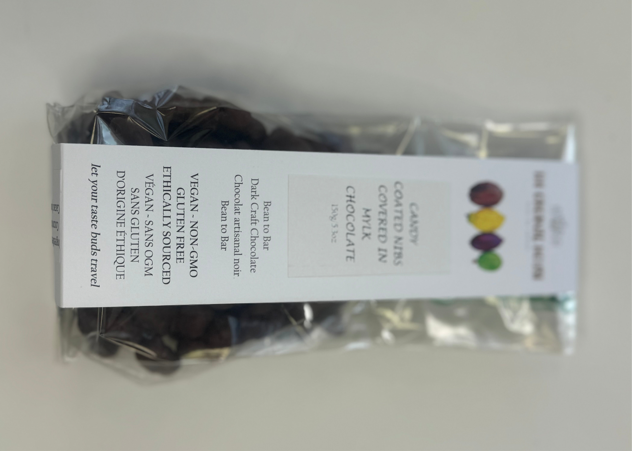Dak Lak Vietnam Nibs covered in Maple candied sugar with a very small dash of cinnamon and sea salt coated in our Maya MYLK chocolate.